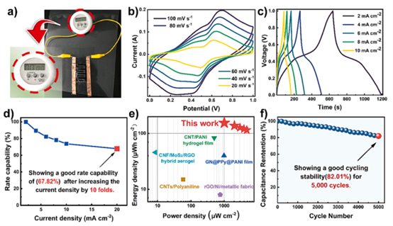 總結:該圖完成了從材料到器件的性能評估閉環。它不僅證明了組裝的超級電容器能夠正常工作(驅動電子表),更重要的是通過一系列標準化的電化學測試和與前沿研究的橫向對比,定量地證明了該器件在面電容、能量/功率密度、倍率性能和循環壽命等關鍵指標上具備優異的綜合性能,為其在柔性可穿戴電子領域的應用前景提供了扎實的數據支撐。
