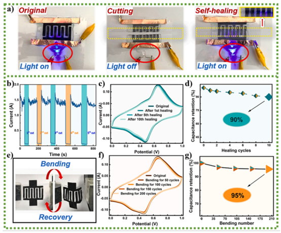 總結:該圖通過巧妙的實驗設計(破壞-修復、彎曲測試)和全面的表征手段(直觀演示、實時監測、電化學測試),不僅令人信服地證明了該超級電容器具備卓越的自修復能力和機械柔性,還定量評估了這些能力在實際應用中的耐久性。這完美呼應了題目中的“自修復”和“柔性”特性,是本文工作超越傳統超級電容器、邁向智能耐用型儲能器件的核心創新體現。
