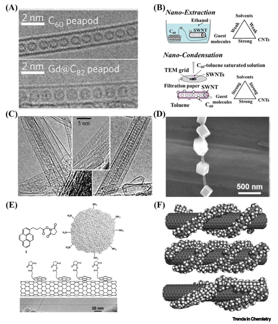 圖2. 碳納米管(CNTs)多種非共價功能化的合成策略與圖像。(A) 封裝型碳納米管(C??和Gd@C??)的透射電子顯微鏡(TEM)圖像。經許可轉載自[52]。版權所有©2017 Springer Nature。(B) C??通過納米萃取/納米縮合進入單壁納米管(SWNTs)的示意圖。(C) C??封裝的單壁納米管的TEM圖像。(B,C) 經許可轉載自[53]。版權所有©2003 Elsevier。(D) 采用金屬立方體對碳納米管側壁進行修飾的掃描電子顯微鏡(SEM)圖像。經許可轉載自[59]。版權所有©2006 American Chemical Society。(E) 1-芘丁酸與琥珀酰亞胺酯通過π-π堆積吸附在單壁納米管側壁的示意圖。經許可轉載自[60]。版權所有©2001 Elsevier。(F) 聚乙烯吡咯烷酮(PVP)在單壁納米管側壁可能纏繞排列方式的示意圖。經許可轉載自[61]。版權所有©2001 Elsevier。