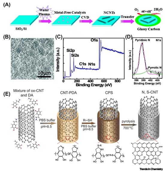 圖4. 摻雜碳納米管(CNTs)的合成策略及電子顯微圖像。(A)氮摻雜碳納米管(N-CNTs)合成示意圖。(B)在水等離子體處理的SiO?/Si基底上生長的N-CNTs的掃描電子顯微鏡(SEM)圖像。(C)N-CNTs的X射線光電子能譜(XPS)全譜掃描。(D)N-CNTs的N 1s精細譜。(A-D)經許可轉載自[76]。版權所有©2010美國化學會。(E)采用兩步法“接枝-熱解”策略制備N, S共摻雜CNTs的示意圖。(E)經許可轉載自[15]。版權所有©2017 Wiley-VCH。縮寫:CVD,化學氣相沉積;DA,多巴胺;PDA,聚多巴胺。