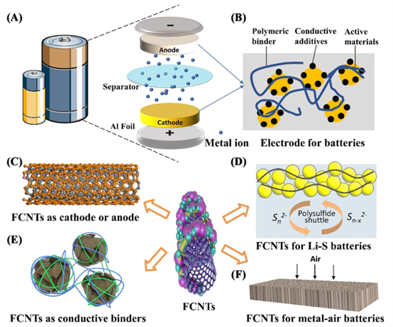 B(電極結構):將視角聚焦到電池的核心功能單元——電極。展示了典型的復合電極由活性材料、導電劑和粘結劑組成,這為理解FCNTs如何融入并革新電極設計(C-F)提供了基礎。