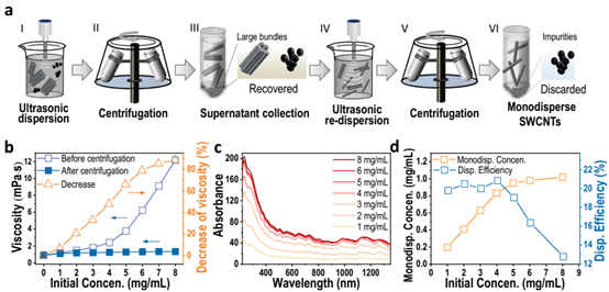 通過兩步分散法實現了SWCNTs溶液濃度突破(1 mg/mL),結合凝膠色譜技術將單手性物種分離產率提升1個數量級。