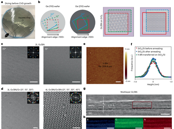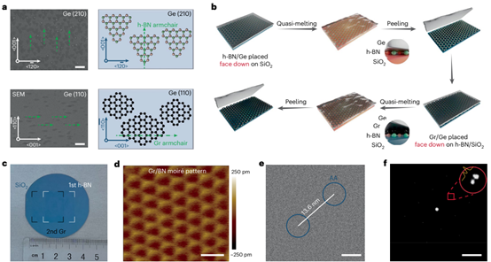 真空環境下的準熔融轉移法,成功制備出大面積、無褶皺、界面清潔且角度可控的石墨烯/氮化硼超晶格: