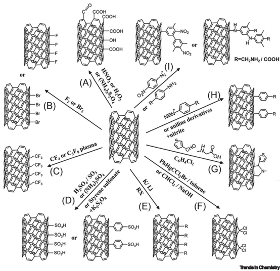 外壁修飾:利用π-π堆積、靜電作用吸附聚合物(如聚乙烯吡咯烷酮)或小分子(如芘衍生物),提升溶解性。