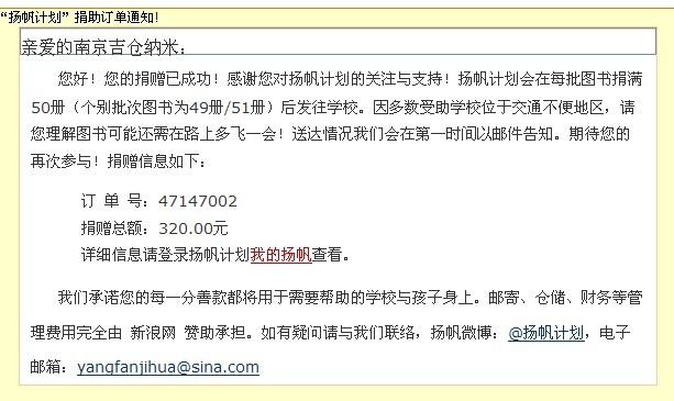 上兩次捐款都是300元,為什么這次多出20元呢?這里有個故事。有位石凱同學在我支付寶里多匯了20元貨款,我電話跟他說明此事,想退回多出的錢。他說等下次購買的時候,多優惠點就行了。優惠是肯定的,但我公司多得這20元是不合適的。征得他的同意,把錢捐給楊帆計劃。所以,這次是320元。