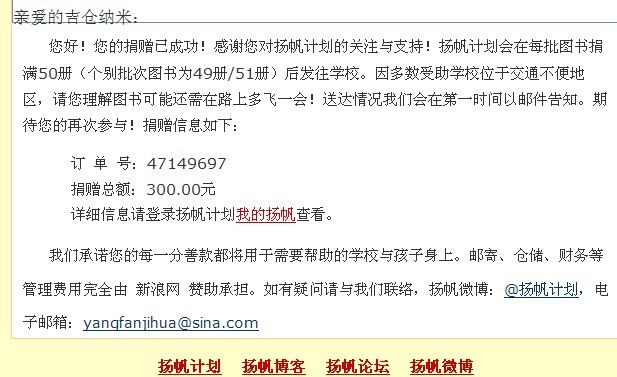我公司第五次楊帆計(jì)劃捐款已經(jīng)匯出。