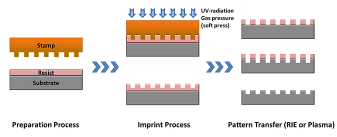 Nanoimprinting Technology (NIL) 納米壓印技術是制備納米尺度圖案的一種方法。這種方法工藝簡單,成本低廉,可大規模生產,且生產出來的圖案具有很高的分辨率。在這里,納米尺度的圖案是由壓印模具壓印光刻膠再加上后續的工藝步驟制備形成的。光刻膠一般由單分子或聚合物構成,且固化方式為熱固化或紫外固化。壓印模具與光刻膠之間的粘附力需要被精確控制以獲得最合適的壓印效果。