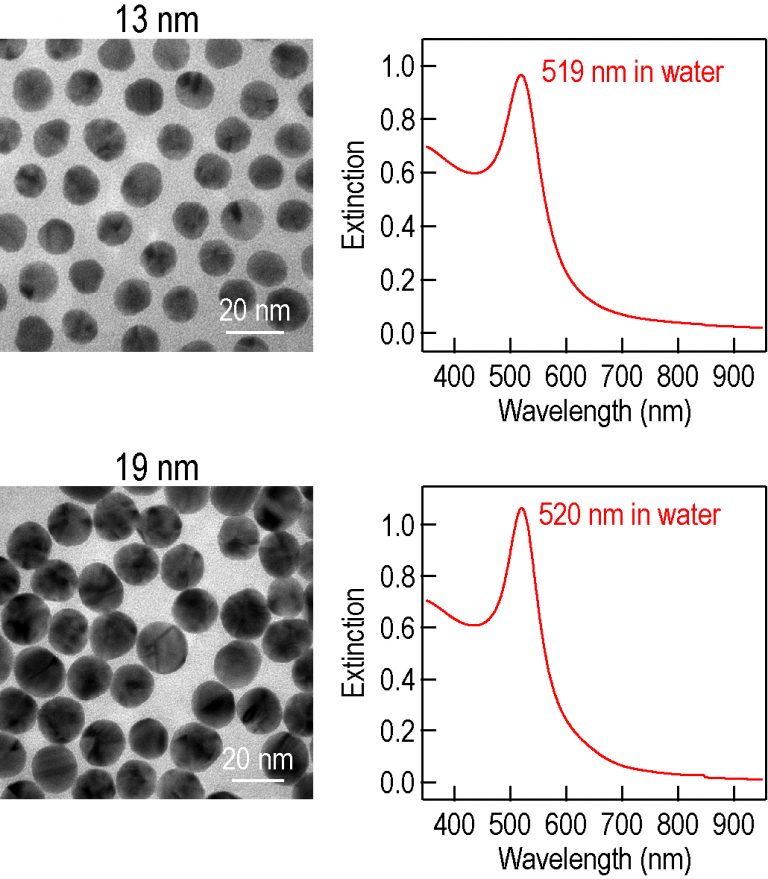 CITRATE包覆金納米球樣品通過檸檬酸鈉鹽在水中還原金的三價鹽而得到。金納米球水溶液中有額外的檸檬酸鈉鹽(~0.5 mM)幫助穩定金納米球。