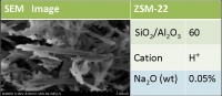 ZSM-22孔道可以抑制積碳的產生,對小分子反應具有較強的擇形性。由于具有適宜的孔道結構和較強的表面酸性,可應用于催化裂解、加氫裂解、脫蠟、異構化(如石蠟異構化和丁烯骨架異構化)、烷基化、脫烷基化、加氫、脫氫、脫水、環化和芳構化反應等方面。